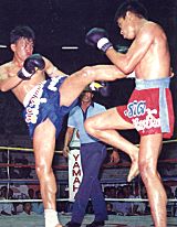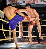 Muay Thai / Thai Boxen ist einer der ältesten Kampfkunstarten. Vermutet wird, dass das Muay Thai aus dem Süden Chinas nach Thailand gebracht wurde. Thailändische Soldaten wendeten Muay Thai gegen Ihre Gegner an. 1560 wurde es zum Nationalsport in Thailand. Das Muay Thai ist dem Kickboxen ähnlich, wenn gleich noch effektiver. Im Muay Thai sind zusätzlich zu den Tritten und Fausttechniken auch noch Ellbogen• und Kniestösse erlaubt, dies macht das Muay Thai besonders im Nahkampf sehr effektiv. Aus diesem Grund gilt Muay Thai seit Hunderten von Jahren bis heute als eine der härtesten Kampfsportarten überhaupt. In Thailand ist diese Kampfkunst Volkssport, der vielen Menschen dort als Touristenattraktion ihren Lebensunterhalt sichert. Im Gegensatz zu früher können gute Kämpfer heutzutage sehr viel Geld verdienen. In Thailand kennen die zahlreichen Liebhaber dieses Sports nahezu jeden Boxer und schliessen regelmässig Wetten auf ihren Favoriten ab. Sie verfolgen die Kämpfe mit leidenschaftlichem Interesse, entweder live oder bei einer der mehrmaligen Übertragungen pro Woche im Fernsehen. Die I.C.B.O. hält sich beim Muay Thai stark an die thailändischen Regeln, d.h. Ellbogen• und Knietechniken sind zum Kopf erlaubt. Der Clinch wird nicht direkt unterbrochen. Bei Titelkämpfen müssen die Kämpfer den Wai Kruh vorführen.