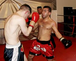 Einen spektakulären Kick Box Fight lieferten sich Yunus Baykus (Kong Sao Kerpen) und Johannes Richter (Kung Fu Recklinghausen). Der kleinere Kämpfer Baykus stürmte mit seinen Fäusten direkt nach vorne. Richter versuchte ihn mit Kicks auf Distanz zu halten. Baykus schaffte es immer wieder in die Nahdistanz zu kommen, wo er schwere Fausttreffer landen konnte. Richter musste zweimal angezählt werden. In der 2. Runde machte Baykus wieder enormen Druck und landete weitere Treffer. Während eines Schlagabtausches, kam Richter durch und schickte Baykus mit einer harten Rechten zu Boden. Baykus zeigte einen enormen Kampfwillen. Er steckte den Niederschlag gut weg und bestimmte wieder den Kampf. Richter wurde langsam müde, musste weiter einstecken und ging durch eine Linke zu Boden. K.o. Sieger in Runde 2 Yunus Baykus.