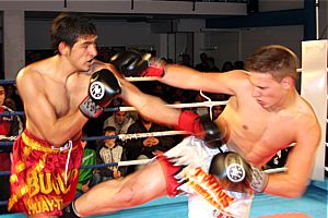 Im Muay Thai boten sich Nasim Aliev (Asia Ratingen) und Rene Stark (Bodyshock Gissen) einen tollen Kampf. Nach kurzem Abtasten fingen beide Kämpfer an. Aliev brachte Fäuste und anschließend Lowkicks. Stark arbeitete vorrangig mit Kick- und Knietechniken. Die erste Runde endete ziemlich gleichwertig. In der 2. Runde war Aliev der aktivere Kämpfer. Er traf mit Lowkicks und seinen Fäusten. Stark versuchte mit Konteraktionen Treffer zu landen, dies gelang ihm aber nicht, da Aliev ziemlich beweglich war und nach seinen Angriffen auf Distanz ging. Auch in der 3. Runde konnte Aliev die besseren Treffer ans Ziel bringen. Besonders mit seinen Fäusten konnte er punkten. Stark versuchte es mit eingesprungenen Knietechniken und im Clinch explodierte er mit seinen Knien. Aliev hatte den Kampf unter Kontrolle. Sieger durch Punkte Nasim Aliev.