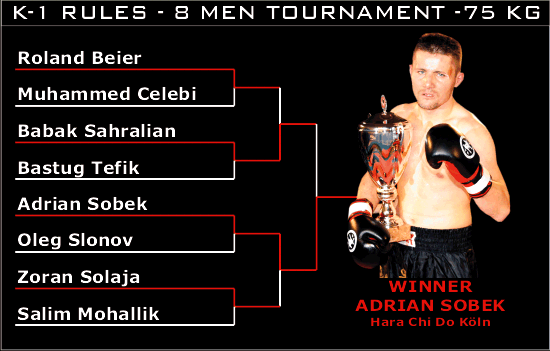 Halbfinale 1 / Roland Beier vs. Babak Sahreian Der Kampf wurde von beiden Kämpfern sehr offensiv gestartet. Beide Kämpfer schlugen mit Fäusten aufeinander ein. Mit einer Linken schickte Sahraeian seinen Gegner zu Boden. Beier kam in den Kampf stärker zurück. Seine Knie konnte er auch zum Einsatz bringen. Der Kampf endete mit einem Unentschieden und ging in die Extrarunde. Sahraein konnte alle seine Energien noch einmal mobilisieren und bestimmt den Kampf, mit seiner Linken, gefolgt von seinem Lowkick. Sieger durch Punkte in der Extrarunde Babak Sahraeien.